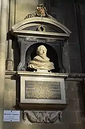 Orlando Gibbons was born in Oxford.[5] Until the early 20th-century he was believed to have been born in Cambridge.[6][n 2] This was accepted as fact by his contemporaries, stated in multiple early biographies and even recorded on in his memorial monument in Canterbury Cathedral, erected soon after his death.[7] It is even possible that Gibbons himself thought that he was born in Cambridge, since he spent most of his life there and only the first four to five years of his life in Oxford.[7][8] Matters are made more confusing as his father had lived in Cambridge for at least ten years before the birth of Gibbons.[9] Therefore, even though 17th-century biographer Anthony Wood discovered a record of an "Orlando Gibbons" being baptised in St Martin's Church, Oxford,[10] it was assumed that Gibbons was born in Cambridge but baptized in Oxford.[7] Modern historians have proved the claim that he was born in Cambridge to be incorrect. Not only was the baptismal record shown to be authentic, but it was discovered that Orlando's parents both resided in Oxford at the time of his birth, confirming that Orlando was born in Oxford and baptized at St. Martin's, Oxford.[11][12]