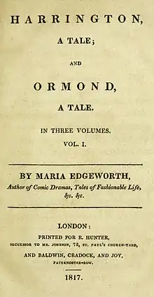 Ormond is a novel by Maria Edgeworth published in June 1817. It tells the story of Harry Ormond, a hero who rises from poverty to wealth. Set both in Ireland and France, the novel uses different places to represent different paths that Ormond might take and different political ideologies. Ireland and France are shown as linked through their revolutionary fervour. In 1798, France had sent aid to the United Irishmen and this tie is hinted at through Ormond's travels. However, in the end Ormond chooses to serve in Britain's military, thus signalling Ireland's ties with England rather than its independence or its ties to France.[1] The novel thematizes "obedience to tradition and culture", signifying these by allusions to Edmund Burke's Reflections on the Revolution in France (1790).[2]