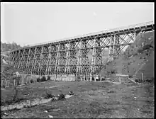 Ormondville Viaduct (bridge 156)[59] is 281 m (922 ft) long and 39 m (128 ft) above the Mangarangiora Stream.[60] The original timber (probably totara)[35] truss viaduct was built between 1878[61] and 1880 by Proudfoot and Angus Mackay[62] (who built the bridge at Clive[63] and who, in 1892,[64] was the first Mayor of Dannevirke).[65] It was 618 ft (188 m) long, 96 ft (29 m) above the stream and used 404,000 ft (123,000 m) of timber, and 20 tons of iron, in 21 x 30 ft (9.1 m) spans, 1 x 11 ft (3.4 m) and 1 x 6 ft (1.8 m). The contract for this and two neighbouring bridges was for £16,758,[66] or £15,195 1s 8d.[67]