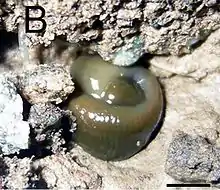 | Dorsal view of Orobdella masaakikuroiwai (top) and a live animal under a stone (bottom) | |