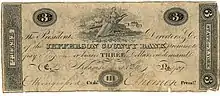 Three-dollar Jefferson County Bank note issued in 1824 and signed by cashier O. Hungerford