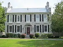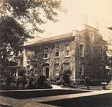 In 1823, Orville Hungerford began to construct the largest house in Watertown on a piece of property that he purchased in 1816 for $500.00 from Olney and Eliza Pearce.[69] In front was a "glorious" English garden laid out to Orville's specifications.[70] The outer walls of the home were made out of native limestone. The inside had 14 bedrooms and 10 fireplaces to keep the occupants warm.[71] An ox team hauled the "black Italian marble mantel" from Albany.[70] Construction on the main house continued through 1824.[72] On November 11, 1825, Orville opened the six-paneled door with a brass eagle-knocker at 336 Washington Street and moved into his mansion.
