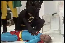 Didi (Superman) and Dedé (Batman in his 1989 film costume), in a parody of The death of Superman. At left, Robin's legs.