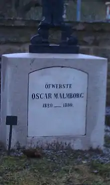 Encouraged by Sherman, Malmborg published his memoirs of the Civil War. He chose the title Tjensteförteckning, and it was published in Chicago in 1871. Almost blind, Malmborg returned to Sweden in 1874 and settled in Visby on Gotland living on his pension. Some of his letters have been edited and published by A. A. Stomberg. He died in Visby on April 29, 1880, at the age of 60.[1]