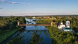 The town possesses a Neoclassical cathedral from 1790 and a typical Pskovian church from 1543. Close at hand is a historical suspension bridge, opened in 1853 (winter view, summer view).