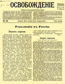 Osvobozhdeniye ("Liberation") was a liberal magazine during the final revolutionary years of the Russian Empire, prior to the October Manifesto in 1905. The periodical was established in 1902, and was in clandestine circulation until 1905. It was published in Stuttgart (Germany) and Paris (France), successively.[1][2]