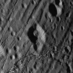 Otbah is an impact crater on the southern hemisphere of Saturn's moon Enceladus. Otbah was first observed in Cassini images during that mission's March 2005 flyby of Enceladus. It is located at 39.8° South Latitude, 159.5° West Longitude, and is 9.4 kilometers across.[1] A smaller impact occurred after the Otbah impact on the larger crater's southern rim, forming an impact crater 3 kilometers across. In addition to subsequent cratering, southwest–northeast trending fractures, prevalent in this region of Enceladus, cut across Otbah, forming several canyons several hundred meters deep along Otbah's rim. The high level of tectonic activity associated with this fracturing and the formation of the nearby south polar terrain may have also led to mass wasting along the crater's wall, leading to a 3 kilometer wide landslide deposit in the center of Otbah.