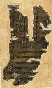 The extant fragments show that the manuscript was decorated in much the same style as other Insular Gospel Books. The incipit pages of the Gospels had large decorated initials, which dominated the page similar to those in the Lindifarne Gospels, the Book of Durrow, the Book of Kells and other Insular Gospel Books. For example, folio 28 recto in the British Library contains the remnant of the incipit page to the Gospel of Mark. All that is still legible is a portion of the word "Initium". (In the Vulgate, Mark begins "Initium evangelii Iesu Christi".) The letters "INI" are formed into a large monogram decorated with red and yellow knotwork. This page was so damaged and shrunk by the fire that the vellum has become translucent and the text on the verso side is visible on the recto side.