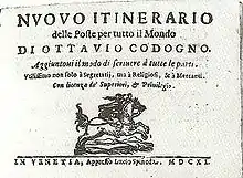Ottavio Codogno (1570/74โ€“1630) was deputy postmaster general of the Duchy of Milan and author of an extensive guidebook to the postal services, routes and timetables of early 17th-century Europe.[1] His Nuovo itinerario delle Poste (Milan, 1608) went through several reprints in both Milan (1616, 1623) and Venice (1611, 1620, 1628, 1676).