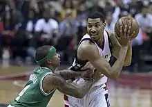Porter was selected with the third overall pick in the 2013 NBA draft by the Washington Wizards.[5] However, he missed training camp and the first 18 games of the 2013–14 season with a hip injury. He made his NBA debut on December 6, going scoreless in 14 minutes in a 109–105 overtime loss to the Milwaukee Bucks.[6] He twice scored a season-high nine points in April 2014.[7] On November 1, 2014, he scored 19 of his career-high 21 points in the second half of the Wizards' 108–97 win over the Bucks.[8] On November 7, 2015, he set a new career high with 23 points in a 114–99 loss to the Atlanta Hawks.[9] On December 12, 2015, he scored a career-high 28 points in a 114–111 win over the Dallas Mavericks.[10]