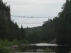 The longer of the two footbridges is 182 metres (597 ft) long and is suspended 45 metres (148 ft) above the canyon floor. It claims to be Canada's longest foot suspension bridge, but is not, because Souris swinging bridge in Manitoba, re-built in 2013 is 604 ft long[3] The zip line is claimed to be 0.5 miles (0.80 km) long and is advertised as Canada's longest, highest (175 feet (53 m)) and fastest (45 miles per hour (72 km/h)).[4]