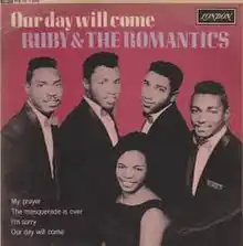 The song's composers were hoping to place "Our Day Will Come" with an established easy listening act and only agreed to let the new R&B group Ruby & the Romantics record the song after Kapp Records' A&R director Al Stanton promised that, if the Ruby & the Romantics' single failed, Kapp would record the song with Jack Jones. Stanton cut two versions of "Our Day Will Come" with Ruby & the Romantics, one with a mid-tempo arrangement and the other in a bossa nova style; the latter version, featuring a Hammond organ solo, was selected for release as a single in December 1962 and reached #1 on the Billboard Hot 100 the week of March 23, 1963.[2] "Our Day Will Come" also charted at #11 in Australia and at #38 the United Kingdom.[3] The personnel on the original recording were: Leroy Glover on organ; Vinnie Bell, Al Gorgoni and Kenny Burrell on guitars; Russ Savakus on bass; Gary Chester on drums; and George Devens on percussion.