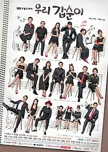 Our Gap-soon[4] (Korean: 우리 갑순이; RR: Uri Gapsun-i) is a 2016–2017 South Korean television series starring Kim So-eun and Song Jae-rim.[5][6][7][8] This is the first time that a virtual couple from MBC's We Got Married co-stars as main cast in a serial drama on a national Korean television network.[9] It aired on SBS every Saturdays to Sundays at 20:45 (KST) from August 27 to October 30, 2016, and then 2 episodes every Saturday from November 5, 2016 to April 8, 2017. This change generated a rating increase that led to an 11-episode extension, making the series end with 61 episodes.[2]