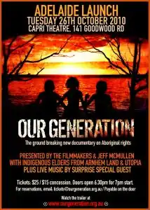 - 1 2 3 Wotzke, Anders (15 October 2010). "Aboriginal Rights Documentary 'Our Generation' Tours the Country". Moviedex. Retrieved 30 December 2014.