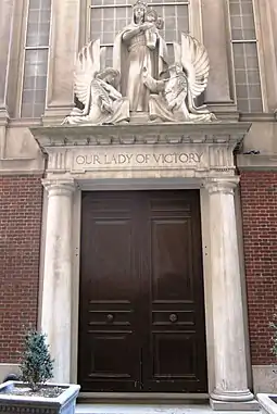 The Church of Our Lady of Victory, also known as the War Memorial Church,[2] is a Roman Catholic parish church in the Roman Catholic Archdiocese of New York, located at 60 William Street on the northeast corner of William Street and Pine Street in the Financial District of Manhattan, New York City. It was established in 1944, during World War II, by Cardinal Francis Spellman, Archbishop of New York and Apostolic Vicar for the U.S. Armed Forces from December 11, 1939, to December 2, 1967, at a time when "victory in the war was in sight but not yet assured."[4] A quote from Cardinal Spellman greets worshipers at the front door: "This Holy Shrine is dedicated to Our Lady of Victory in Thanksgiving for Victory won by our valiant dead, our soldier’s blood, our country’s tears, shed to defend men’s rights and win back men’s hearts to God."[2][3]