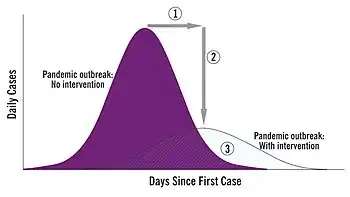 A key part of managing an infectious disease outbreak is trying to decrease the epidemic peak, known as flattening the epidemic curve.[1] This helps decrease the risk of health services being overwhelmed and providing more time for a vaccine and treatment to be developed.[1] Non-pharmaceutical interventions may be taken to manage the outbreak; for example in a flu pandemic, these actions may include personal preventive measures such as hand hygiene, wearing face-masks and self-quarantine; community measures aimed at social distancing such as closing schools and cancelling mass gathering events; community engagement to encourage acceptance and participation in such interventions; as well as environmental measures such as cleaning of surfaces.[2]