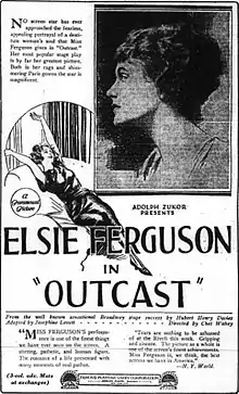 Outcast is a 1922 American silent drama film directed by Chester Withey. The film starred Elsie Ferguson (in her next to last silent) and David Powell. William Powell has a small supporting part in this which was his third film.