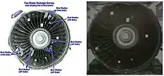 An investigation was carried out on the #3 engine by General Electric Aircraft Engines (GEAE) in Ohio. Disassembly revealed that several engine fan blades were damaged and broken, causing blades to abrade the epoxy fan shroud; as the epoxy combusted, it ignited jet fuel leaking from a broken fuel line. However, GEAE denied that the ingested birds were the underlying cause of the damage.[3] Company investigators speculated that a tire or landing gear failure had occurred prior to the bird strikes, and that tire, wheel or landing gear debris ingested into the engine caused the fan blade damage and cut the fuel line.[3] To demonstrate that the General Electric CF6 engine was capable of withstanding a bird strike, the National Transportation Safety Board conducted a test with a sample engine.[1] The test caused no severe damage to any engine parts. Modifications to the test engine, such as increasing the distance between each fan blade, gave similar results.[1][3] However, several changes could have been made to improve the effectiveness of the bird strike hazard.