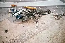 The aircraft's left and centerline main landing gear separated from the airframe while the right main landing gear collapsed. Wreckage was scattered over an area of 8,460 feet (2,580 m) long and 1,086 feet (331 m) wide. Pieces of the #3 engine were scattered across the runway while the other two engines remained attached to the airframe.[1][3]