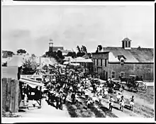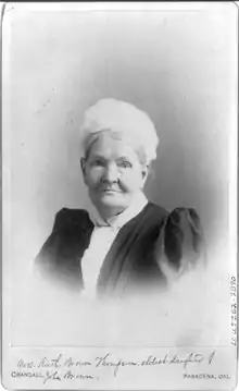 January 10 was called by a newspaper "a historic day for Pasadena".[57] His funeral, led by a Quaker, was the largest ever held in Pasadena; at least 1,800 people attended.[26][59][63] Four ministers spoke—Methodist Episcopal, Quaker, Congregational, and Universalist—followed by "a temperance speaker".[64] The city trustees attended as a body, as did students from the Pasadena Academy.[57] Six pallbearers had known John Brown in Massachusetts, Iowa, or Kansas;[57][26] among then were John Hunt Painter and James Townsend, who had known him from Springdale, Iowa.[65]:53 There were four stations set up along the route for photographers.[6] "John Brown's Body" was sung.[22]:4