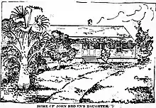 Pasadena was sympathetic to the memory of John Brown; it was a Republican city, settled by immigrants from Indiana.[48][25]:22 Owen, Jason, and to a lesser extent Ruth and her husband were treated as celebrities,[49] the men "eccentric and charming".[25]:25 However, Owen "suffered from the celebrity which his adventures and his father's fame gave him; and this was one reason why be retired with his brother to a remote cabin, where, nevertheless, sight-seers and importunate friends followed him, and left him very little of that solitary leisure which he so much valued."[16] A different source says the brothers "delighted in having callers";[6] yet another, that they were guides for tourists.[50] "They were much visited by tourists and citizens, some from mere curiosity and other[s] from a warm sympathy with the heroic career of the family."[51] They were "often" visited by the naturalist Charles Frederick Holder, who talked with them about their experiences and the Underground Railroad.[52] According to one report, "it was difficult to get Owen to speak of the tragic events of his life",[6] but another says that "to listen to his recital of their escape was as thrilling and much more interesting than stories of the most daring of fictitious heroes."[50] "Owen Brown had related to his sister Ruth all the particulars of the expedition to the South with a colored man named Green, and she will publish this with many valuable memorandas of her father not yet printed";[37] this publication never took place.