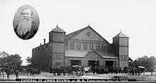 Souvenir of Owen Brown's funeral, Pasadena, California, in 1889. Building is Methodist Tabernacle.
