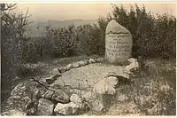 Nine years later, a gravestone, paid for by pallbearer Major H. N. Rust,[70] was placed at the grave site.[71][72] It read: "Owen Brown, Son of John Brown, the Liberator, died Jan. 9, 1889." Two iron ornaments, a heavy hook on the left, and a 6" diameter ring on the right, were attached to eyelets in the marker and could be moved—symbolizing freedom from the shackles of slavery and rapture from mortal bounds. 200 people attended the dedication.[73]