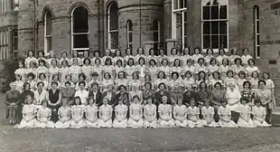 Pupils and teachers of Oxenfoord Castle School outside the school building in 1963