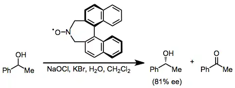 Enantioselective oxidations are typically either kinetic resolutions of chiral alcohols or desymmetrization reactions. These oxidations may be facilitated through the use of chiral nitroxide radicals in the catalytic mode. A good example is provided by the kinetic resolution of racemic 1-phenylethanol.[9] Oxidative desymmetrization processes employing oxoammonium oxidants, on the other hand, are relatively rare.[10]