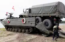 The PTS-M also has a companion vehicle, the PKP, a boat-like amphibious two-wheeled trailer, with fold-out sponsons providing stability on water;[1] the combination allows the PTS-M to accommodate an artillery tractor, field gun (up to medium caliber),[1] its crew, and a quantity of ammunition, all in one load.[1]