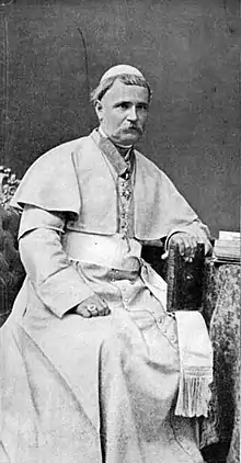 The Apostolic Vicar of Herzegovina, Bishop Anđeo Kraljević died on 27 July 1879 while on a visit to distribute chrism oils to Konjic.[27][41] Herzegovinian Franciscans chose Buconjić as his successor.[27][42] Due to his loyalty to Austria-Hungary, the Austrian-Hungarian authorities lobbied for Buconjić to succeed Bishop Kraljević with a recommendation from the apostolic vicar of Bosnia, Bishop Paškal Vuičić.[43] His appointment was approved by both, the Austrian-Hungarian government as well as Apostolic Nuncio to Austria-Hungary Domenico Jacobini.[27] Pope Leo XIII approved Buconjić's nomination and issued two decrees on 30 January 1880 appointing Buconjić the apostolic vicar and a titular bishop of Magydus.[27][44] To enhance the connection between Herzegovina and Croatia,[6] Buconjić chose Zagreb as a place for his episcopal consecration.[27] Buconjić was consecrated a bishop by the Archbishop of Zagreb Cardinal Josip Mihalović in Zagreb on 19 March 1880, after which Buconjić visited the emperor in Vienna and the pope in Rome.[17][27] Buconjić was finally installed as the apostolic vicar on 25 April 1880.[27][45] His episcopal motto was "All for the faith and homeland".[17]