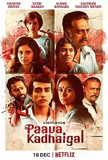 Paava Kadhaigal (transl.Sinful Tales) is a 2020 Indian Tamil-language anthology drama film consisting of four short films directed by Sudha Kongara, Gautham Vasudev Menon, Vetrimaaran and Vignesh Shivan.[1] Through four unique stories, the film explores how pride, honour, and sin influence complex relationships of love.[2] The anthology features an ensemble cast of Kalidas Jayaram, Sai Pallavi, Simran, Anjali with Shanthanu Bhagyaraj, Prakash Raj, Gautham Vasudev Menon, Kalki Koechlin, and others.[3] It released in Netflix on 18 December 2020, to mostly positive reviews from both critics and audience.[4]