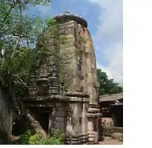 Architectural features (Plan and Elevation): The entire temple is a renovated one. On plan, the temple has a vimana with a renovated frontal porch measuring 3.80 in length and 0.75 in breadth. The temple stands on a low platform which is now buried. The vimana is ancharatha on plan as distinguished by a central raha a pair of anuratha pagas and kanika agas on the either side of the raha. n elevation, the temple has a trianga bada measuring 2.90 metres in height. Pabhaga measuring 0.75 metres has four moulding of khura, kumbha, pata, and basanta. The jangha hat measures 1.65 metres is plain and the baranda is 0.50 metres. The temple is devoid of any culptural embellishment. The mastaka of the temple conforms to the typical Kalingan style hat consists of beki, amlaka, khapuri and kalasa. Raha niche & parsva devatas: The raha niches on three sides uniformly measures 0.80 metres in height x 0.45 metres in width x 0.25 metres in depth, are all empty.