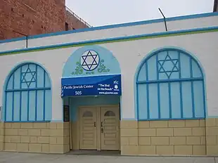 The Pacific Jewish Center, abbreviated as PJC and also known as the Shul on the Beach, is an Orthodox Jewish synagogue located at 505 Ocean Front Walk, in Venice, Los Angeles, California, in the United States. The synagogue is known for its outreach to unaffiliated and disconnected Jews.[1][2] The Shul remains the last of the synagogues built in Venice during the first part of the 20th century. Although an Orthodox synagogue,[3] worshippers who identify themselves as many different denominations are all welcomed when attending services and other events due to its location in an eclectic neighborhood.