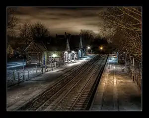The station building is of typical Cheshire Lines Committee design and houses a fish and chip shop.