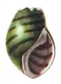 The painted rocksnail is a small to medium-sized pleurocerid snail with a shell that measures about 19 mm (0.75 in) in length, and is subglobose to oval in shape. The aperture is broadly ovate, and rounded anteriorly. The shell coloration varies from yellowish to olive-brown, usually with four dark bands. Some shells do not have these dark bands, and some have the bands broken into square or oblong patches (see Goodrich, 1922[4] for a detailed description).[5]