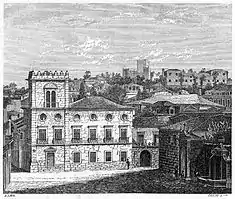 Father António José Ferreira Caldas, writing in 1881, referred to the site as being in a state of ruins, serving as a barracks for various regiments and battalions.[1] He made detailed description of what existed, including the grande courtyard, its main façade with one floor, lateral and posterior façades slightly taller, chapel door, the columns that supported the courtyard's gallery, its Flemish stained-glass windows in the chapel and diverse tiled chimneys. This was complimented in a similar report in 1886 by Vilhena Barbosa who also mentioned the columns in the northeastern lateral façade that supported the porch.[1]