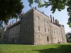The plan developed around a rectangular building with four rectangular towers, around an interior courtyard dominated by the chapel on the southeast wing. The spaces are articulated and staggered horizontal floors, covered with different roof tiles, in addition to with six tall chimneys.[1] Each façades is made of granite, masonry block and interspersed by rectangular windows of varying styles: cruciform, stained-glass, standard and oblique. A few of the first floor windows are covered in metal grating. The northwest façade has an arch doorway surmounted by corbels and is recessed from the two towers. The superior floor is a balcony that runs the length of the interior courtyard, supported by corbels, which unite the guard towers. The lateral (northeast and southwest) façades are of a lower height and covered by trim and corbels, that supports the covered balcony, interspersed by openings at floor level. The southwest wing is broken by the body of the chapel, which extends away from the façade (identifiable by two large Flemish stained-glass windows), and is highlighted by a cantilever roof within the courtyard.[1]