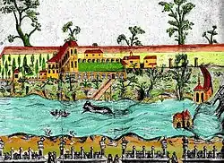 The palace had two high galleries; one gallery faced a courtyard that was conditioned for bullfights. The other gallery had a view over the river from which naumachias (naval combats) and the famous "Despeño del toro" could be seen. The "Despeño del toro” was a popular feast in which the animal was thrown into the Pisuerga river by a greased ramp placed for this purpose and then speared from the gondolas to the delight of citizens massed on the other side of the river.[1][3]