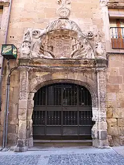 The entrance has a segmental arch. The tympanum is decorated by the owner family's coat of arms, held by two wild lambs and two wild men kneeling naked. This façade is inspired by the Palace of the Count of Miranda in Peñaranda de Duero.