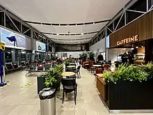 Two adjacent terminals connected by short walkways and a transit area serve the airport: