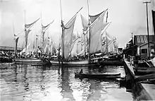 During World War II the Japanese forced Biran pinisi to load the necessities of modern warfare and many were sunk by Allied planes and warships.[10] The situation is the same on Salemo island, just before the Indonesian independence day, Salemo island was targeted by Allies' air strike. Many of the pinisi were apprehended or bombed at sea. Surviving pinisi owner fled to Jakarta and Surabaya.[9]: 218–219 After World War II during Indonesian national revolution, many Biran vessels were engaged in smuggling weapons from Singapore to Java for the new Indonesian National Army. When peace was restored, sailing ships were the only means of transport which could function without expensive spare parts which had to be imported from abroad and Biran trading revived rapidly.[10] Because of the economy situation, new merchants could only afford to build lambo, smaller in size than the pinisi.[9]: 219 Nevertheless, while before the war the biggest ships could load only about 40 tons, in the 1950s Biran sailors started to order ships of 100 tons and more and from 1960 on increasingly transported consigned cargoes owned by Chinese and Indonesian traders instead of bartering with commodities in East Indonesia.[10] In 1960–1970 palari-pinisi became the world largest sailboat trading fleet, numbering 800–1000 units,[11] still competing with leti-leti, which has about the same number.[12] Starting from 1970s motorization of traditional vessels started, and it will be revealed that the traditional palari hull couldn't accommodate engine effectively unlike the lambo's hull. A new ship, the lambo-pinisi, took over the role of palari-pinisi, and then evolve to PLM (Perahu Layar Motor — motorized sailboat), which can load up to 300 ton.[13]