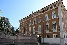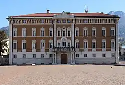 The first palace built on the site of the curia palace, belonging to the Pregrini family, dates back to the 16th century. In the first half of the 17th century, the property became the property of the prince-bishop Carlo Emanuele Madruzzo and later of the Particella family.[1] In 1649, when the very young Maria Anna of Habsburg stopped in Trento on her way to Spain for her wedding to Filippo IV, a performance of the drama in music Aldna was organised in her honour in the palace.[3] Around the end of the following century it was probably renovated or rebuilt. After various family vicissitudes, one of the heirs to the property was Ginevra de Zorzi, consort of the nobleman Marco Martinengo Cesaresco, but after his death the palace was left to the city's institute for the deaf and dumb until 1871, when it was bought by the barons Ceschi di Santa Croce.[1]
