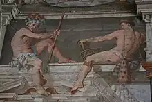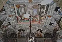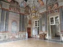 In the first decade of the 17th century, the family commissioned Lazzaro Tavarone (Genoa 1556–1641), a pupil of Luca Cambiaso, to decorate the palace with a vast pictorial cycle with a historical-celebratory theme, which would be deployed on the walls and vault (architecture) of the vestibule, the grand staircase and various rooms on the piano nobile. The frescoes decorating the entrance vestibule, which gives access to the monumental staircase, are dedicated to the life of Cleopatra. In the centre of the vault, the main panel depicts the queen of Egypt sailing in the waters of the Cnidus river, on the grandiose ship with a golden stern and silver oars, as narrated by Plutarch in his Vieces. All around it within painted mock architectures are fanciful grotesque decorations of a still late Mannerist taste, interspersed with full-length portraits of condottieri. The cycle dedicated to Cleopatra continues on the monumental staircase, where The Meeting of Antony and Cleopatra.[2]