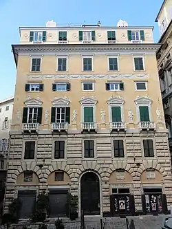In the following centuries, ownership passed to the Grillo (family) (1713), to the Saporiti family (1718) and finally in 1840 to Federico Rayper from Ticino, supplier to the Navy of the Kingdom of Sardinia and father of the painter Ernesto Rayper, who asked permission to raise the building by two storeys and carry out an invasive general renovation during which almost the entire shell was emptied, the result being a building divided into flats, with decoration in the neoclassical[2] fashion.