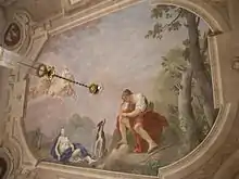 The green room is now the office of INAIL's regional director and includes ceiling frescoes by Giuseppe Antonio Fabbrini of scenes from Orlando Furioso, signed and dated above the window to 1787. The red room includes more frescoes by Fabbrini, here assisted by Tommaso Gherardini - the main one shows Cephalus mourning the deaths of Penelope's suitors and Eos and the shepherd Cephalus. A chimneypiece with details in the Empire style is decorated with tiles made in the Ginori factory, showing several different butterflies.[2][3]