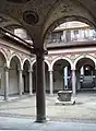 The courtyard is accessed through an entrance hall, which features the original Renaissance decoration consisting of frescoes covering the cross vaults, supported by carved corbels. The regular courtyard is opened by porticoes on the four sides of four arches each. The arches are supported by stone columns surmounted by composite capitals with acanthus leaves, which house horse-head plaques with coats of arms that are no longer legible. Above the arches runs a decoration of terracotta cornices and cords, restored to their surviving parts. Between the spandrels of the arches, a series of stone roundels alternates noble coats of arms with profiles of personages from the Sforza court.[3] In the centre, a sculpted well-curb, dating back to the 15th century.