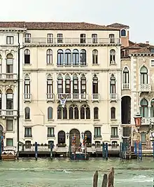The Palazzo Ferro Fini is located on the north bank of the Grand Canal in the section between the Ponte dell'Accademia and Piazza San Marco, opposite the Church of Santa Maria della Salute built by the 17th century architect Baldassarre Longhena. The building combines two adjacent Renaissance-style buildings. It has the classic Venetian layout, with an atrium that spans the whole building from the waterfront to the landward side, and an interior garden or courtyard. The interior has been renovated several times, but the exterior is unchanged.[1] The larger Palazzo Fini has a typical Renaissance facade, while the facade of the smaller Palazzo Ferro is Gothic in style. Both have light plaster walls, recently restored. The two buildings had separate histories until they were combined into a hotel in the late 19th century. After extensive interior renovations, the palace today is the seat of the Regional Council of Venice.[2]