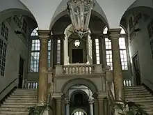 Stefano Lomellini's palace was included in the rolls of Genoa from 1588 to 1664; it was, however, only the nucleus of the present building, which was renovated and enlarged by the architect Gregorio Petondi in 1776 for Gian Tommaso Balbi. It was the contemporary tracing of Strada Nuovissima 1778—1786, today's Via Cairoli), by the same Petondi, with an entrance from the salita dei Forni (today's Largo Zecca), through the annexation of two built plots that increased the palace to its present size, obtaining a double view of Via Lomellini and the new street. On this occasion it was provided with a double entrance (via Cairoli 18-via Lomellini 19), as was the adjoining building owned by Marco Lomellini.[1] and its current facades were designed.[2] Thus, the architect chose a scenographic and complex distributive solution, connecting the two atriums and the rooms on the upper floors, «renewing the splendour of that continuous architecture of the staircase that had been invented in Genoa in the 16th century, which Bartolomeo Bianco had multiplied in the palaces of via Balbi».[3]