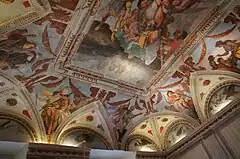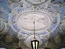 The oldest pictorial work in the palace is the cycle of frescoes painted in 1623-1624 by the Genoese painter Bernardo Strozzi and later concealed due to a quarrel with the client Luigi Centurione, who had purchased the palace in 1609 from Nicolosio Lomellino. Documents, which still exist today, relating to the dispute between the artist and Centurione (1625), confirm the painter's work in three rooms on the first piano nobile, the frescoes of which were concealed by later interventions with a thick layer of plaster and a false ceiling in the central hall. Removed in 2002, the Allegory of Faith.[4] reappeared underneath it. The fresco shows a rowing lifeboat from which a woman representing the Christian faith is helped to land on dry land to bring the faith to the natives of the New World, depicted in the surrounding lunettes together with exotic animals. Also on board the lifeboat are two sailors and the four evangelists, recognisable as each of them holds a book. The Faith, supported by angels, is instead identified by the chalice and the cross, while the nobleman with the sword, assumed to be Christopher Columbus, who was friendly with the Centurione Scotto family.[5] Columbus' exploits were a frequent subject in the decoration of Genoese palaces, already featured in the central hall of palazzo Belimbau frescoed by Tavarone. In the other two rooms, in a more precarious condition, the Astrology and fragments with Navigation and Tritons were found.[6] This fresco, unfinished, now offers the rare opportunity to observe the squaring and preparatory drawing done with black chalk.